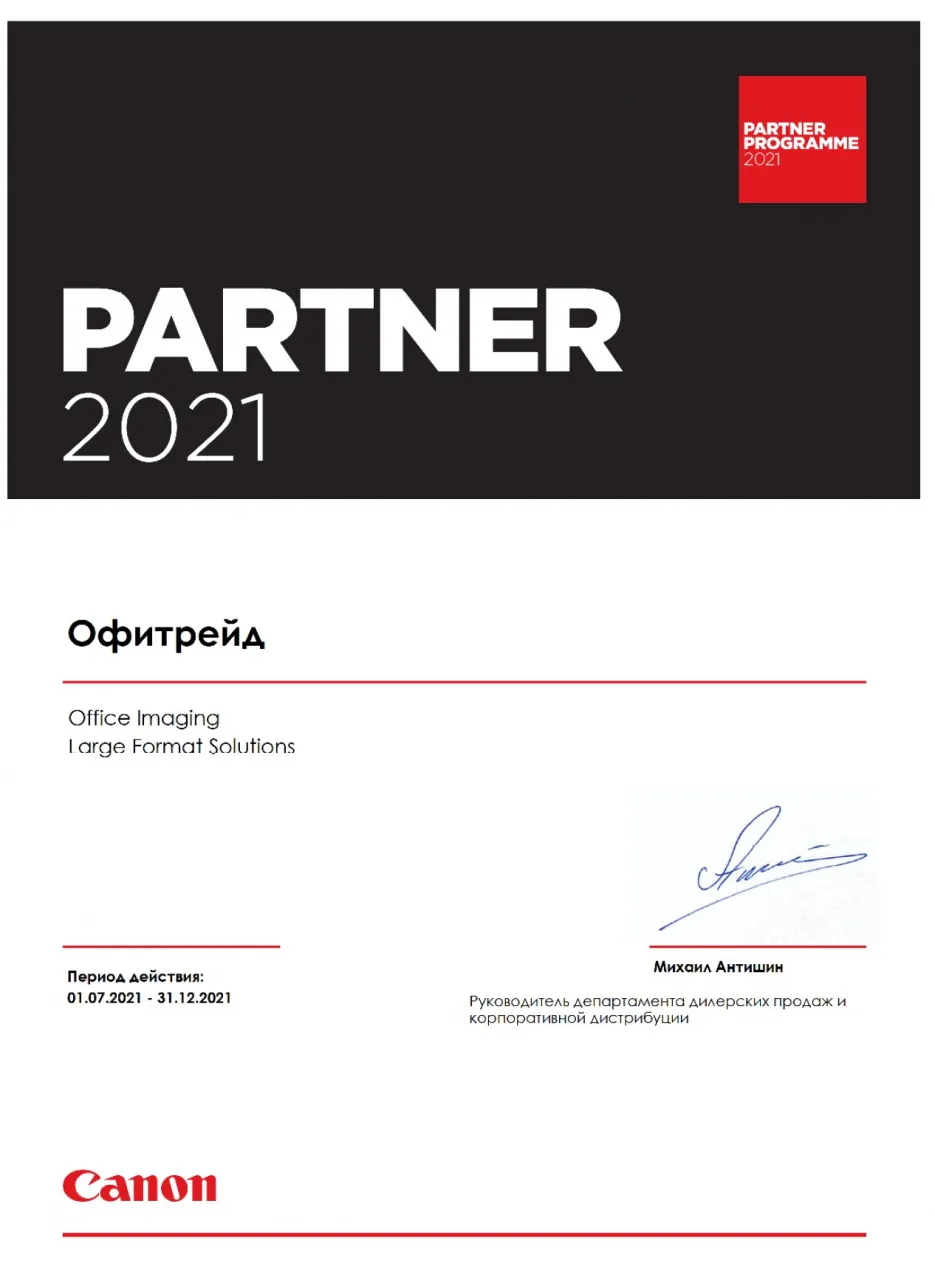 Компания OfiTrade продолжает партнёрство с Canon. Многолетняя история сотрудничества компаний, это дополнительный маркер нашего профессионализма и компетенции, в любых вопросах, связанных с офисной оргтехникой, расходными материалами и широкоформатными принтерами Canon.