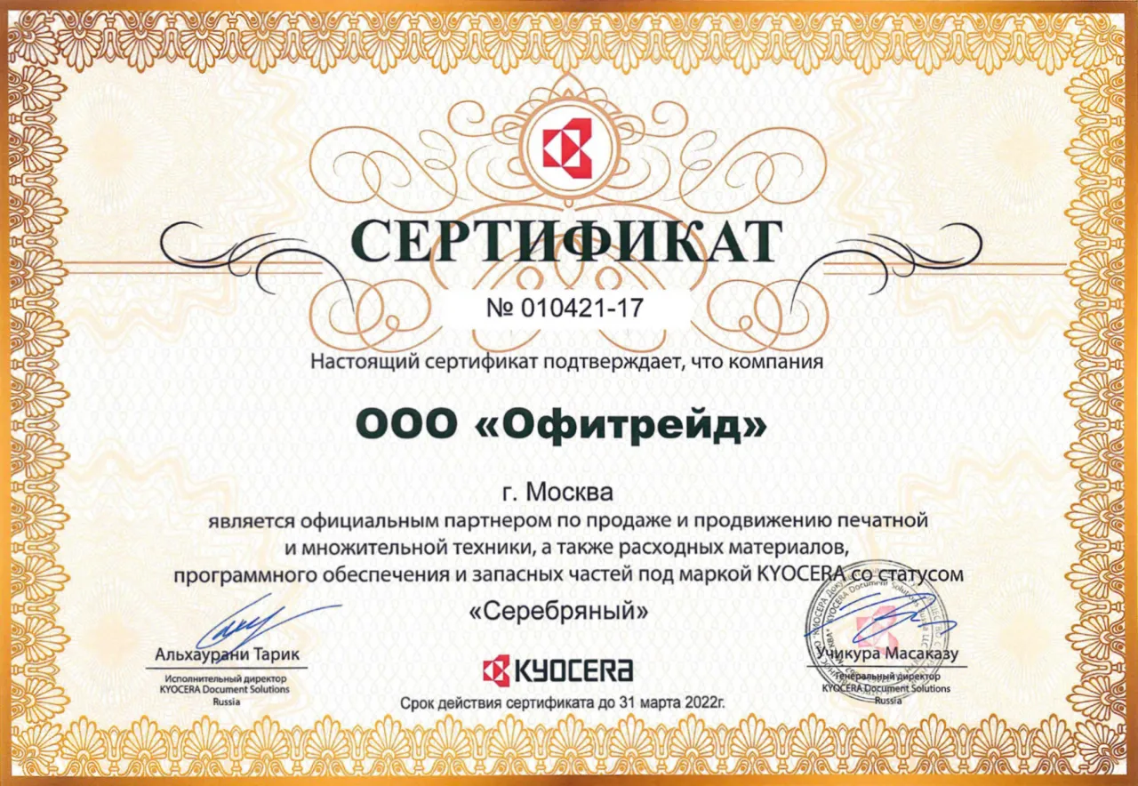 OfiTrade подтвердил статус Авторизованного "Серебряного" партнера Kyocera и отвечает всем установленным требованиям.